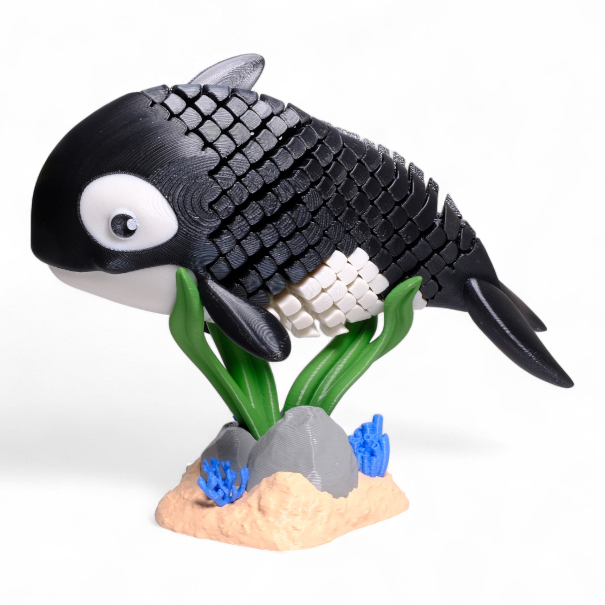 Bu hareketli Orca (katil balina) figürü, 3D baskı teknolojisiyle özenle üretilmiştir ve özel deniz temalı standı ile birlikte gelir. Siyah-beyaz gövdesi, detaylı yüzgeçleri ve gerçekçi yüz ifadesiyle, hem oyun zamanı hem de dekoratif kullanım için mükemmel bir seçimdir.